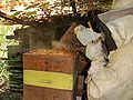 Apart from the honey stored within the central brood frames, the bees store surplus honey in combs above the brood nest. In modern hives the beekeeper places separate boxes, called 'supers', above the brood box, in which a series of shallower combs is provided for storage of honey. This enables the beekeeper to remove some of the supers in the late summer, and to extract the surplus honey harvest, without damaging the colony of bees and its brood nest below. If all the honey is 'stolen', including the amount of honey needed to survive winter, the beekeeper must replace these stores by feeding the bees sugar or corn syrup in autumn.