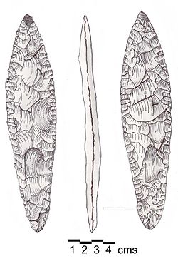 Canaanean Blade. Suggested to be part of a javelin. Fresh grey flint, both sides showing pressure flaking. Somewhat narrower at the base, suggesting a haft. Polished at the extreme point. Found on land of the Lebanese Evangelical School for Girls in the Patriarchate area of Beirut.