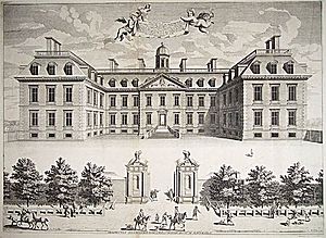 The principal entrance hall, reception and family bedrooms were placed on the first floor above a low semi-basement containing service rooms. The two principal entrances to the mansion in the centre of both the north and south facades were accessed by external staircases, originally a single broad flight on the north side and a double staircase on the south. These staircases have since been replaced by the simpler designs illustrated on the plan (right).