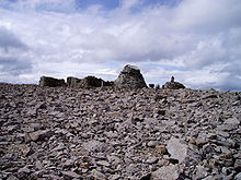 The summit of Ben Nevis comprises a large stony plateau of about 40 hectares (100 acres). The highest point is marked with a large, solidly built cairn atop which sits an Ordnance Survey trig point.
