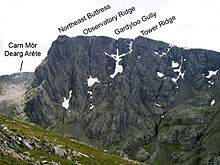 The north face contains dozens of graded rock climbs along its entire length, with particular concentrations on the Càrn Dearg Buttress (below the Munro top of Càrn Dearg NW) and around the North-east Buttress and Observatory Ridge. Classic rock routes include Rubicon Wall on Observatory Buttress (Severe) – whose second ascent in 1937, when it was considered the hardest route on the mountain, is described by W. H. Murray in Mountaineering in Scotland – and, on Càrn Dearg, Centurion (HVS) and Agrippa (E5).