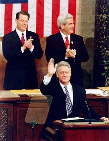 Clinton was elected president in 1992, defeating incumbent president George H. W. Bush. As president, Clinton presided over the longest period of peacetime economic expansion in American history. He signed into law the North American Free Trade Agreement. He implemented Don't ask, don't tell, a controversial intermediate step to full gay military integration. After the failed Clinton health care plan attempt, the Republican Party won control of the Congress in 1994 for the first time in 40 years. Two years later, the re-elected Clinton became the first member of the Democratic Party since Franklin D. Roosevelt to win a second full term as president. He successfully passed welfare reform and the State Children's Health Insurance Program, providing health coverage for millions of children. Later, he was impeached for perjury and obstruction of justice in a scandal involving a White House intern, but was acquitted by the U.S. Senate and served his complete term of office. The Congressional Budget Office reported a budget surplus between the years 1998 and 2000, the last three years of Clinton's presidency.