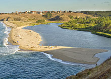 The estuary of the Veleka in the Black Sea. Longshore drift has deposited sediment along the shoreline which has led to the formation of a spit, Sinemorets, Bulgaria