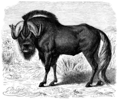 The Black Wildebeest or White-tailed gnu (Connochaetes gnou) is one of two gnu species. The natural populations of this species, endemic to the southern region of Africa, have been almost completely exterminated, but the species has been reintroduced widely, both in private areas and nature reserves throughout most of Lesotho, Swaziland, South Africa, Namibia and Kenya. It was also introduced outside its natural range (Wilson & Reeder, 1993; East, 1989, 1996).