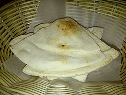 In Morocco and western North Africa a round bread that is roughly four inches (10 cm) tall is used to accompany most of the watery cuisine. Also consumed is a thick and chewy fried bread that is smothered in oil beforehand. The rghifa bread is a staple in the food of Morocco and consists of several layers of lightly cooked bread.