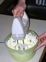 Churning produces small butter grains floating in the water-based portion of the cream. This watery liquid is called buttermilk—although the buttermilk most common today is instead a directly fermented skimmed milk. The buttermilk is drained off; sometimes more buttermilk is removed by rinsing the grains with water. Then the grains are "worked": pressed and kneaded together. When prepared manually, this is done using wooden boards called scotch hands. This consolidates the butter into a solid mass and breaks up embedded pockets of buttermilk or water into tiny droplets.