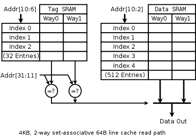 The diagram to the right is intended to clarify the manner in which the various fields of the address are used. Address bit 31 is most significant, bit 0 is least significant. The diagram shows the SRAMs, indexing, and multiplexing for a 4 kB, 2-way set-associative, virtually indexed and virtually tagged cache with 64 B lines, a 32b read width and 32b virtual address.