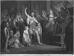 "Caractacus before the Emperor Claudius at Rome", 18th-century print by an unknown artist ( British Museum).