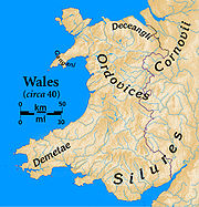 Tribes of Wales at the time of the Roman invasion. The modern English border is also shown.