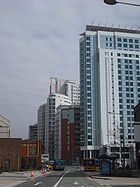 Cardiff Central railway station is the largest railway station in Wales with seven platforms, and one of the busiest in the UK. It provides direct services to nearby Bridgend and Newport, and other major cities such as Birmingham, London, Manchester, Edinburgh and Glasgow. Cardiff Queen Street railway station is the second busiest in Wales and is the hub for routes via the Valley Lines services that connect the South Wales valleys and the Cardiff suburbs with the city centre on the former site of Temperance Town. It is located at the eastern end of the city centre, and also provides services to Cardiff Bay.