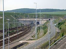 The tunnel carries high-speed Eurostar passenger trains, Eurotunnel Shuttle roll-on/roll-off vehicle transport—the largest in the world—and international rail freight trains. The tunnel connects end-to-end with the LGV Nord and High Speed 1 high-speed railway lines.