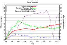 Total cross-tunnel passenger traffic volumes peaked at 18.4 million in 1998, then dropped to 14.9 million in 2003, from then rising again to 17.0 million in 2010.