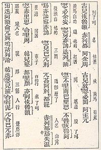 Mongolian text from The Secret History of the Mongols in Chinese transcription, with a glossary on the right of each row.