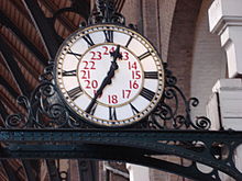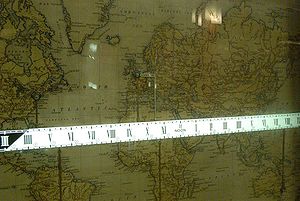A linear clock at London's Piccadilly Circus tube station. The 24 hour band moves across the static map, keeping pace with the apparent movement of the sun above ground, and a pointer fixed on London points to the current time
