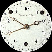 Analogue clocks usually indicate time using angles. The most common clock face uses a fixed numbered dial or dials and moving hand or hands. It usually has a circular scale of 12 hours, which can also serve as a scale of 60 minutes, and 60 seconds if the clock has a second hand. Many other styles and designs have been used throughout the years, including dials divided into 6, 8, 10, and 24 hours. The only other widely used clock face today is the 24 hour analogue dial, because of the use of 24 hour time in military organizations and timetables. The 10-hour clock was briefly popular during the French Revolution, when the metric system was applied to time measurement, and an Italian 6 hour clock was developed in the 18th century, presumably to save power (a clock or watch chiming 24 times uses more power).