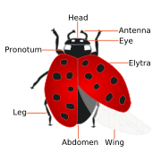 Coccinellidae is a family of beetles, known variously as ladybirds ( British English, Australian English, South African English), ladybugs ( North American English) or lady beetles (preferred by some scientists). The family name comes from its type genus, Coccinella. Coccinellids are found worldwide, with over 5,000 species described, more than 450 native to North America alone. Coccinellids are small insects, ranging from 1 mm to 10 mm (0.04 to 0.4 inches), and are commonly yellow, orange, or scarlet with small black spots on their wing covers, with black legs, head and antennae. A very large number of species are mostly or entirely black, gray, or brown and may be difficult for non- entomologists to recognize as coccinellids (and, conversely, there are many small beetles that are easily mistaken as such, like tortoise beetles).