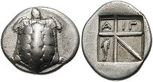 Another candidate for the site of the earliest coins is Aegina, where Chelone ("turtle") coins were minted ca. 700-550 BC, either by the local Aegina people or by Pheidon king of Argos (who first set the standards of weights and measures). In the Bibliothèque Nationale, Paris, there is a unique electrum stater of Aegina.^