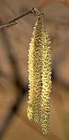 The Common Hazel is a shrub common in many European woodlands. It is an important component of the hedgerows that were the traditional field boundaries in lowland England. The wood was traditionally grown as coppice, the poles cut being used for wattle-and-daub building and agricultural fencing. A selection with twisted branches has been propagated horticulturally as Corylus avellana 'Contorta'.