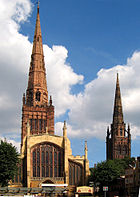 The spire of the ruined cathedral forms one of the "three spires" which have dominated the city skyline since the 14th century, the others being those of Christ Church (of which only the spire survives) and Holy Trinity Church (which is still in use).