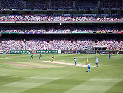 ![]() A bowler bowling to a batsman. The paler strip is the cricket pitch. The two sets of three wooden stumps on the pitch are the wickets. The two white lines are the creases. |