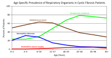 Over time, both the types of bacteria and their individual characteristics change in individuals with CF. In the initial stage, common bacteria such as Staphylococcus aureus and Hemophilus influenzae colonize and infect the lungs. Eventually, Pseudomonas aeruginosa (and sometimes Burkholderia cepacia) dominates. By 18 years of age, 80% of patients with classic CF harbour P. aeruginosa, and 3.5% harbour B. cepacia. Once within the lungs, these bacteria adapt to the environment and develop resistance to commonly used antibiotics. Pseudomonas can develop special characteristics that allow the formation of large colonies, known as "mucoid" Pseudomonas, which are rarely seen in people that do not have CF.