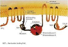 The CFTR gene, found at the q31.2 locus of chromosome 7, is 230,000 base pairs long, and creates a protein that is 1,480 amino acids long. More specifically the location is between base pair 117,120,016 to 117,308,718 on the long arm of chromosome 7, region 3, band 1, sub-band 2, represented as 7q31.2. Structurally, CFTR is a type of gene known as an ABC gene. The product of this gene (the CFTR) is a chloride ion channel important in creating sweat, digestive juices and mucus. This protein possesses two ATP-hydrolyzing domains, which allows the protein to use energy in the form of ATP. It also contains two domains comprising 6 alpha helices apiece, which allow the protein to cross the cell membrane. A regulatory binding site on the protein allows activation by phosphorylation, mainly by cAMP-dependent protein kinase. The carboxyl terminal of the protein is anchored to the cytoskeleton by a PDZ domain interaction.