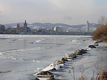 A look upstream from the Donauinsel in Vienna, Austria during an unusually cold winter (February 2006). A frozen Danube usually occurs just once or twice in a lifetime.