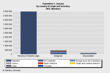 According to 2012 figures from Statistics Denmark, 89.6% of Denmark's population of over 5,580,516 is of Danish descent. Many of the remaining 10.4% are immigrants—or descendants of recent immigrants—from neighboring countries, Turkey, Iraq, Somalia, Bosnia and Herzegovina, South Asia and the Middle East. Of the 10.4%, approximately 200,000 (34%) are of a Western background, and approx. 390,000 (66%) have a non-Western background.