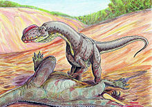 Dilophosaurus (pron.: / d aɪ ˌ l ɒ f ɵ ˈ s ɔr ə s / dy-LOF-o-SAWR-əs or / d aɪ ˌ l oʊ f ɵ ˈ s ɔr ə s /; Greek: di for "two", lophos "crest", and sauros "lizard") is a genus of theropod dinosaur from the Sinemurian stage of the Early Jurassic Period, about 193 million years ago. The first specimens were described in 1954, but it was not until over a decade later that the genus received its current name.