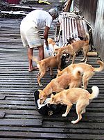 The Dingo (Canis lupus dingo) or Warrigal is a type of Australian canid, which was thought to be descended from the Iranian Wolf (Canis lupus pallipes); however, DNA analysis has shown it to be more closely related to domestic dogs, suggesting that they were introduced from a small population of domesticated dogs, possibly at a single occasion during the Austronesian expansion into Island Southeast Asia. It is commonly described as an Australian wild dog, but is not restricted to Australia, nor did it originate there. Modern dingoes are found throughout Southeast Asia, mostly in small pockets of remaining natural forest, and in mainland Australia, particularly in the north. They have features in common with both wolves and modern dogs, and are regarded as more or less unchanged descendants of an early ancestor of modern dogs. The name dingo comes from the language of the Eora Aboriginal people, who were the original inhabitants of the Sydney area. The New Guinea Singing Dog is also classified as Canis lupus dingo.