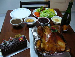 Turkeys are traditionally eaten as the main course of Christmas feasts in much of the world ( stuffed turkey) since appearing in England in the 16th century, as well as for Thanksgiving in the United States and Canada, though this tradition has its origins in modern times, rather than colonial as is often supposed. Before the 20th century, pork ribs were the most common food on the holiday, as the animals were usually slaughtered in November. Turkeys were once so abundant in the wild that they were eaten throughout the year, the food considered commonplace, whereas pork ribs were rarely available outside of the Thanksgiving-New Year season. While the tradition of turkey at Christmas spread throughout England in the 17th century, among the working classes it became common to serve goose, which remained the predominant roast until the Victorian era. While eating turkey was once mainly restricted to special occasions such as these, turkey is now eaten year-round and forms a regular part of many diets.