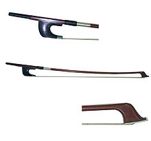 Double bass bows vary in length, ranging from 60 cm (24") to 75 cm (30"). Pernambuco, also known as Brazilwood, is regarded as an excellent quality stick material, but due to its scarcity and expense, other materials are increasingly being used. Less expensive student bows may be constructed of solid fibreglass, or of less valuable varieties of brazilwood. Snakewood and carbon fibre are also used in bows of a variety of different qualities. The frog of the double bass bow is usually made out of ebony, although snakewood and buffalo horn are used by some luthiers. The wire wrapping is gold or silver in many quality bows, and the hair is usually horsehair.