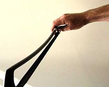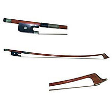 The double bass bow comes in two distinct forms (shown below). The "French" or "overhand" bow is similar in shape and implementation to the bow used on the other members of the orchestral string instrument family, while the "German" or "Butler" bow is typically broader and shorter, and is held in a "hand shake" position.