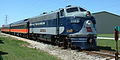 The EMD F7 was a 1,500 horsepower B-B Diesel-electric locomotive produced between February, 1949 and December, 1953 by General Motors' Electro-Motive Division and General Motors Diesel. It succeeded the F3 model in GM-EMD's F-unit sequence, and was replaced in turn by the F9. Final assembly was at GM-EMD's La Grange, Illinois plant or GMD's London, Ontario facility. Although originally promoted as a freight-hauling unit by EMD, the F7 was also used in passenger service hauling such trains as the Santa Fe's El Capitan.