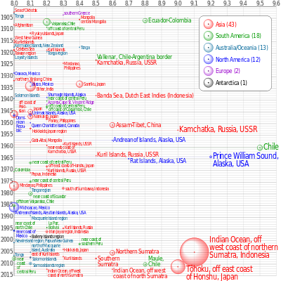 Earthquakes of magnitude 8.0 and greater since 1900. The apparent 3D volumes of the bubbles are linearly proportional to their respective fatalities.