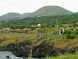 Two ahu at Hanga Roa. In foreground Ahu Ko Te Riku (with a pukao on its head). In the mid-ground is a side view of an ahu with five moai showing retaining wall, platform, ramp and pavement. The Mataveri end of Hanga Roa is visible in the background with Rano Kau rising above it.