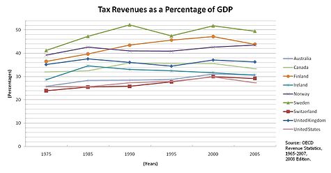 Total tax revenue as a percentage of GDP for Ireland over the past several decades compared to other first world nations.