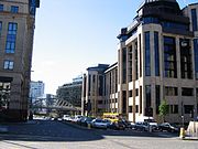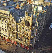 To the immediate west of the castle lies the financial district, housing insurance and banking buildings. Probably the most noticeable building here is the circular sandstone building that is the Edinburgh International Conference Centre.