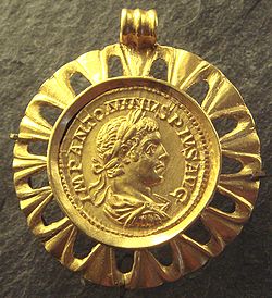 A Roman aureus depicting Elagabalus. The reverse reads Sanct Deo Soli Elagabal (To the Holy Sun God Elagabal), and depicts a four-horse, gold chariot carrying the holy stone of the Emesa temple.