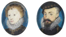 Elizabeth and her favourite, Robert Dudley, Earl of Leicester, c. 1575. Pair of stamp-sized miniatures by Nicholas Hilliard. The Queen's friendship with Dudley lasted for over thirty years, until his death.