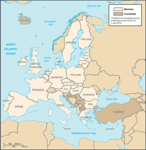 Croatia is an acceding country and is expected to become the 28th member of the EU on 1 July 2013. It signed its accession agreement on 9 December 2011. Iceland, Macedonia, Montenegro, Serbia and Turkey are all official candidates. Albania applied for membership on April 2009 but has not yet been recognised as an official candidate. Bosnia and Herzegovina has concluded an association agreement and is preparing an application for EU membership. Both are classified as potential candidates for membership by the EU. The Western Balkans have been prioritised for membership since emerging from war during the breakup of Yugoslavia; Turkey has been seeking membership since the 1980s and Iceland has lodged its application since suffering economic collapse in 2008.
