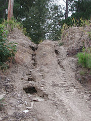 Bank erosion started by four wheeler all-terrain vehicles, Yauhanna, South Carolina