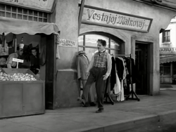 Scene from Chaplin's The Great Dictator with a shop sign reading Vestaĵoj Malnovaj ("Old Clothes").