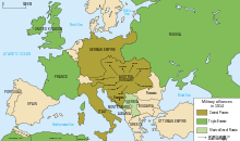 Two World Wars and an economic depression dominated the first half of the 20th century. World War I was fought between 1914 and 1918. It started when Archduke Franz Ferdinand of Austria was assassinated by the Bosnian Serb Gavrilo Princip. Most European nations were drawn into the war, which was fought between the Entente Powers ( France, Belgium, Serbia, Portugal, Russia, the United Kingdom, and later Italy, Greece, Romania, and the United States) and the Central Powers (Austria-Hungary, Germany, Bulgaria, and the Ottoman Empire). The War left more than 16 million civilians and military dead. Over 60 million European soldiers were mobilised from 1914 to 1918.
