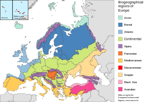 The main natural vegetation cover in Europe is mixed forest. The conditions for growth are very favourable. In the north, the Gulf Stream and North Atlantic Drift warm the continent. Southern Europe could be described as having a warm, but mild climate. There are frequent summer droughts in this region. Mountain ridges also affect the conditions. Some of these ( Alps, Pyrenees) are oriented east-west and allow the wind to carry large masses of water from the ocean in the interior. Others are oriented south-north ( Scandinavian Mountains, Dinarides, Carpathians, Apennines) and because the rain falls primarily on the side of mountains that is oriented towards the sea, forests grow well on this side, while on the other side, the conditions are much less favourable. Few corners of mainland Europe have not been grazed by livestock at some point in time, and the cutting down of the pre-agricultural forest habitat caused disruption to the original plant and animal ecosystems.