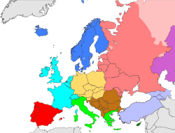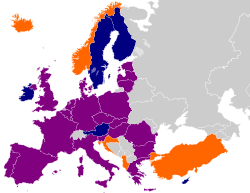 Key: blue: states which straddle the border between Europe and Asia; green: states not geographically in Europe, but closely associated politically
