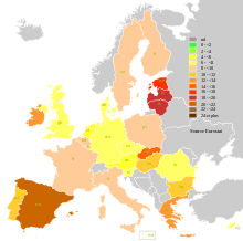 The Eurozone entered its first official recession in the third quarter of 2008, official figures confirmed in January 2009. While beginning in the United States the late-2000s recession spread to Europe rapidly and has affected much of the region. The EU-27 unemployment rate was 10.3% in April 2012. Europe's young workers have been especially hard hit. In April 2012, the unemployment rate in the EU27 for those aged 15–24 was 22.4%.