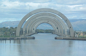 The Falkirk Wheel, named after the nearby town of Falkirk in central Scotland, is a rotating boat lift connecting the Forth and Clyde Canal with the Union Canal. The difference in the levels of the two canals at the wheel is 24 metres (79 ft), roughly equivalent to the height of an eight storey building. The structure is located near the Rough Castle Fort and the closest village is Tamfourhill. On 24 May 2002, Queen Elizabeth II opened the Falkirk Wheel as part of her Golden Jubilee celebrations. The opening had been delayed by a month due to flooding caused by vandals who forced open the Wheel's gates.