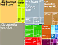 Graphical depiction of Fiji's product exports in 28 colour-coded categories.