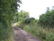 It passes near the Iron Age hill fort of Bury Camp and becomes another section of the county boundary, crossing first the South Wales railway, next the site of an old chapel and spring at Fosse Lodge in Dunley, and then the M4. Thereafter it passes through The Shoe and Netteton Shrub where remains of a posting-station have been found, and arrives at Batheaston. Thereupon it turns due west to follow the river Avon into Bath.